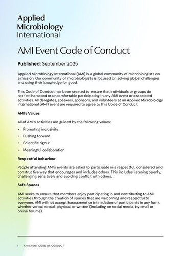 If you are being harassed, notice that someone else is being harassed, or have any other concerns, please contact a member of AMI staff immediately. If you are at a face to face event AMI staff can be identified through their branded name badges, alternatively you can contact the AMI Team by emailing info@appliedmicrobiology.org.